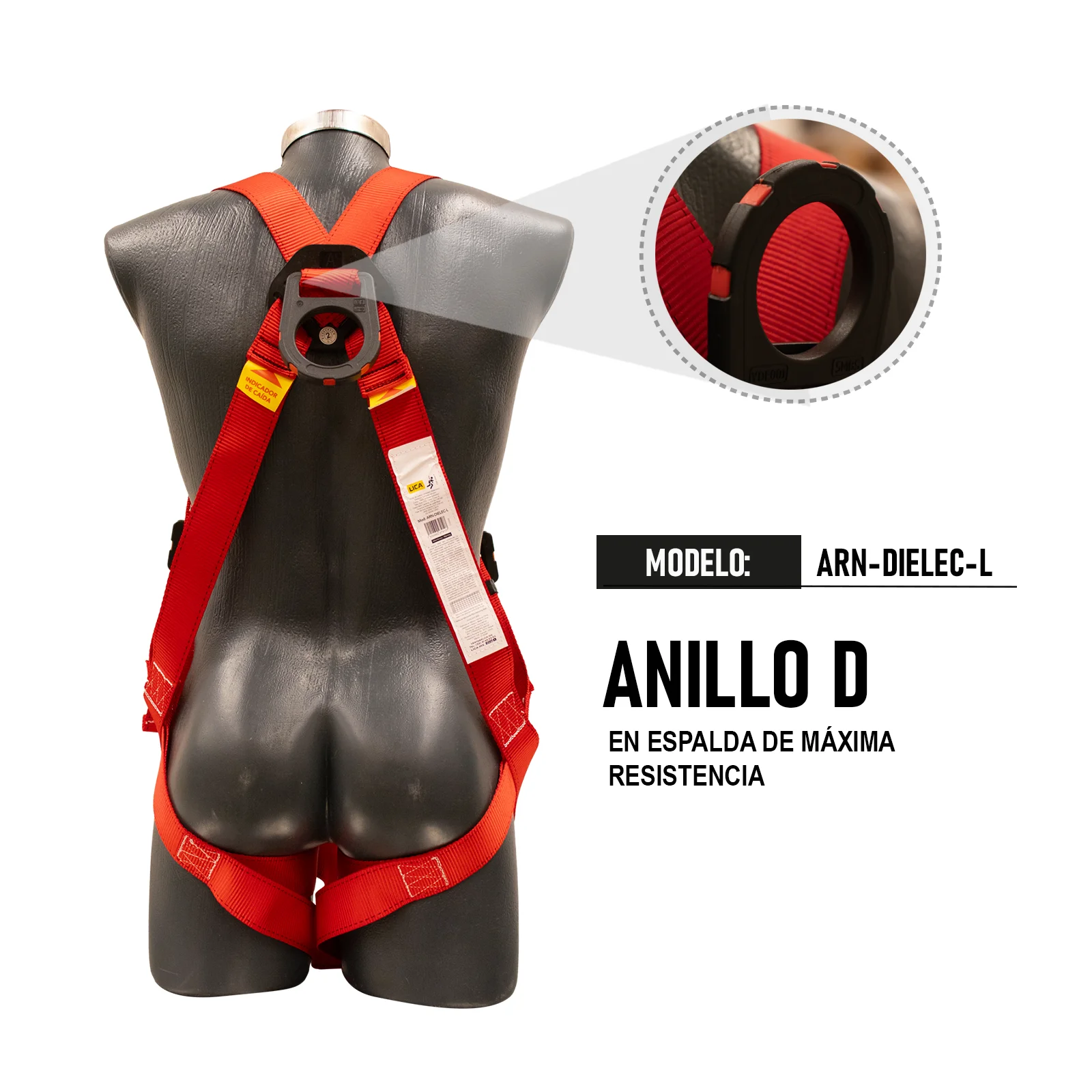El arnés de seguridad modelo ARN-L está fabricado de poliéster y en banda de 1 3/4 de ancho.Cuenta con correas ajustables en pecho, piernas y pelvis. Tiene hebillas de rápida conexión y anillo “D“ en la espalda. El amortiguador de impacto está fabricado de nailon, cuenta con una longitud de 1.83mts y una capacidad de 100kg. Arnés diseñado para proteger al usuario contra caídas al momento de realizar trabajos en los que se presente la electricidad.