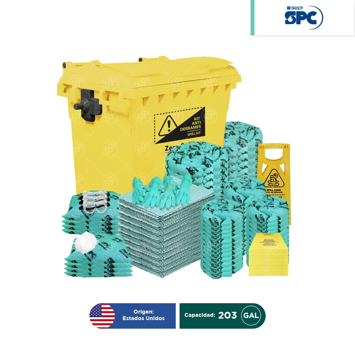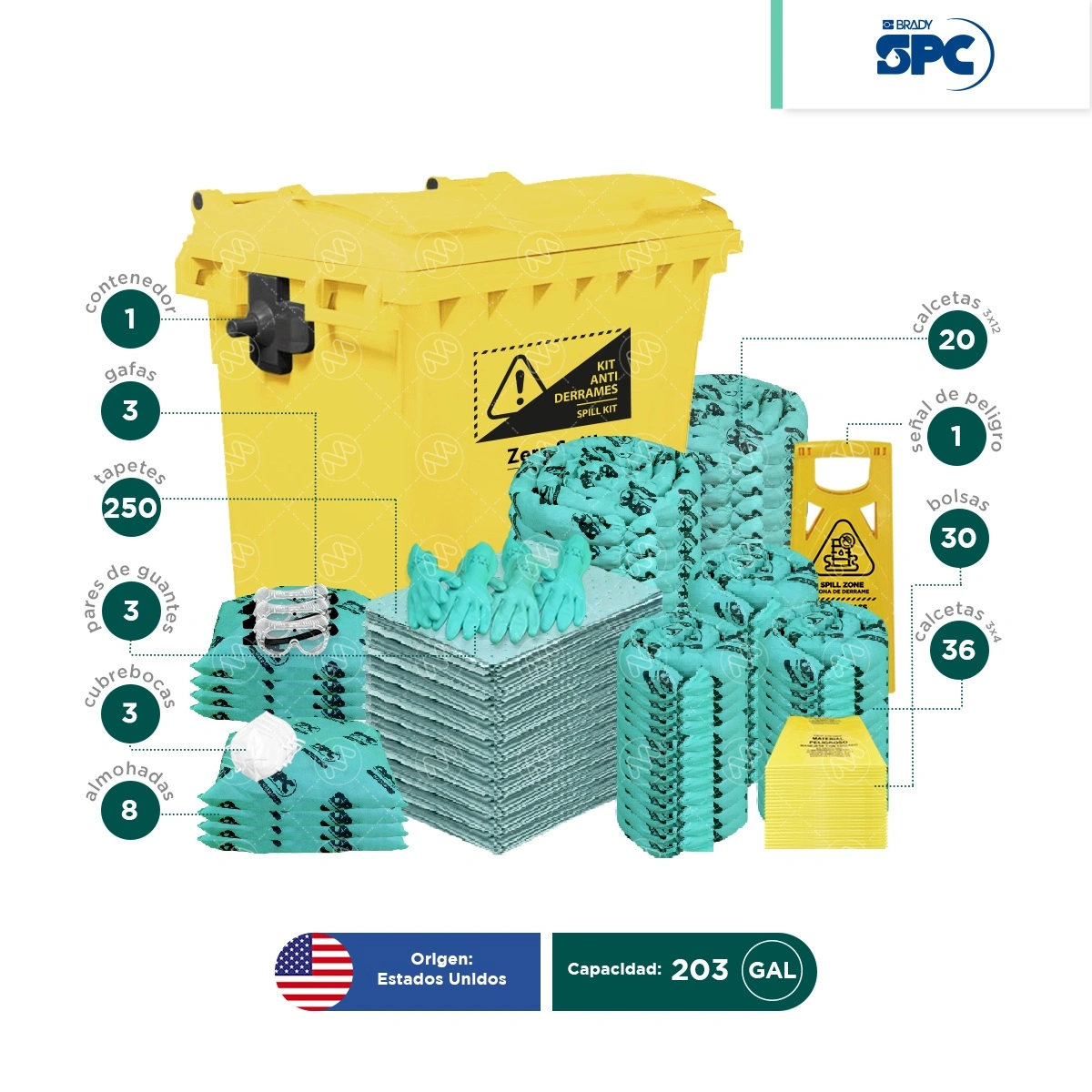 - (8) Almohadas absorbentes hazmat 18″x18″ SPC (SKU: HAZ1818).