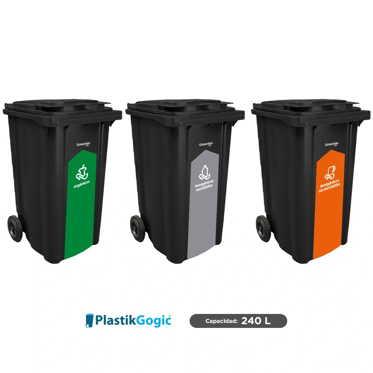 Combo con 3 contenedores con 2 ruedas en color negro y capacidad de 240 L, rotulados y personalizados según las normas de separación de residuos del Gobierno de CDMX, utilizados para la recolección de residuos domésticos y comerciales de la marca Plastik Gogic, están hechos de polietileno de alta densidad (HDPE).