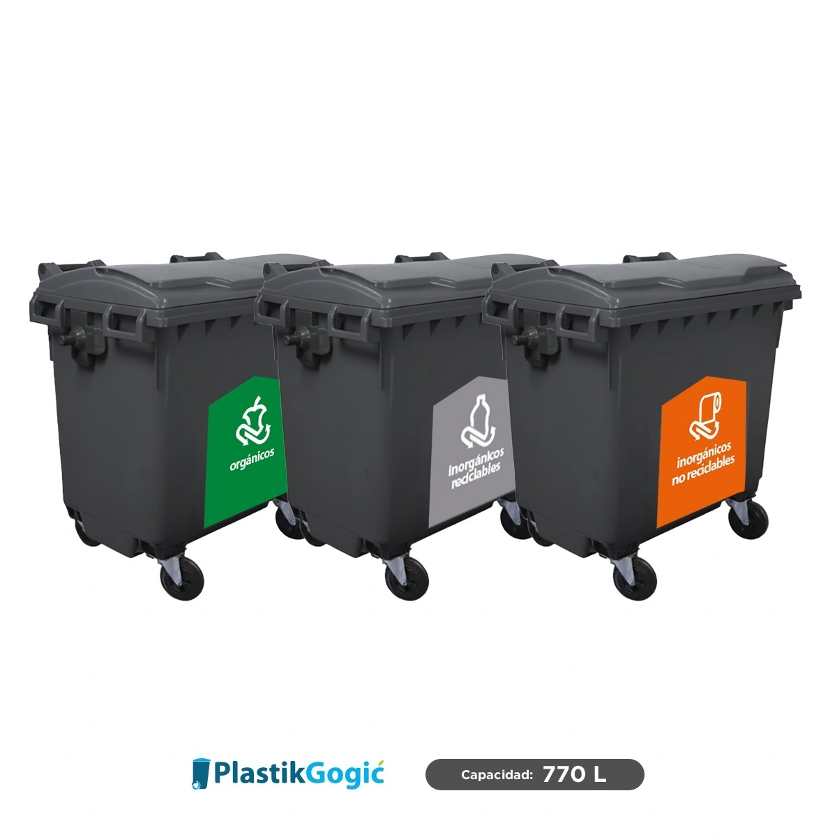Combo con 3 contenedores con 4 ruedas en color negro y capacidad de 770 L, rotulados y personalizados según las normas de separación de residuos del Gobierno de CDMX, utilizados para la recolección de residuos domésticos y comerciales de la marca Plastik Gogic, están hechos de polietileno de alta densidad (HDPE).