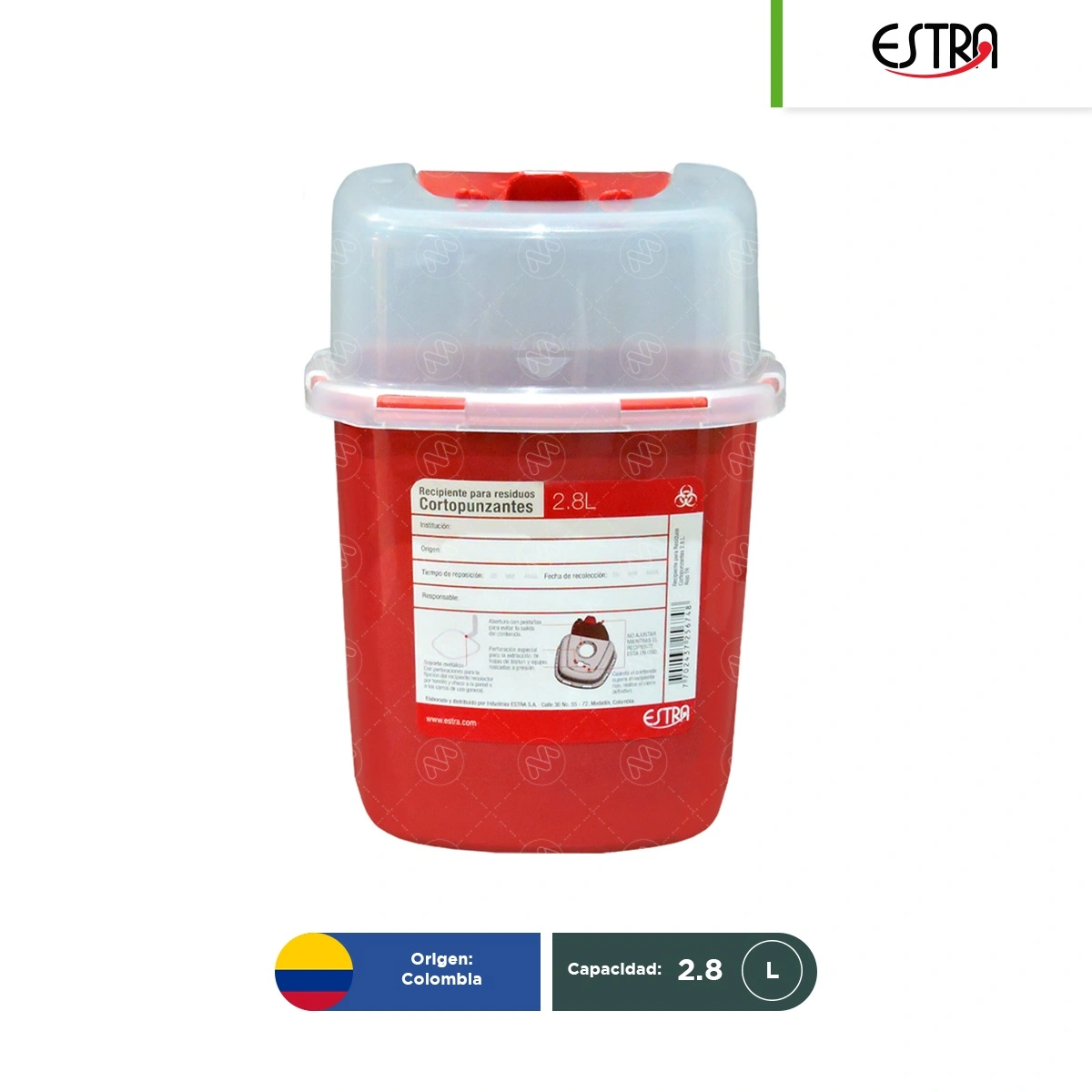El contenedor para punzocortantes de 2.8 litros diseñado con una tapa transparente que permite ver el nivel de llenado del recipiente, está especialmente diseñado para la disposición final de objetos punzocortantes.