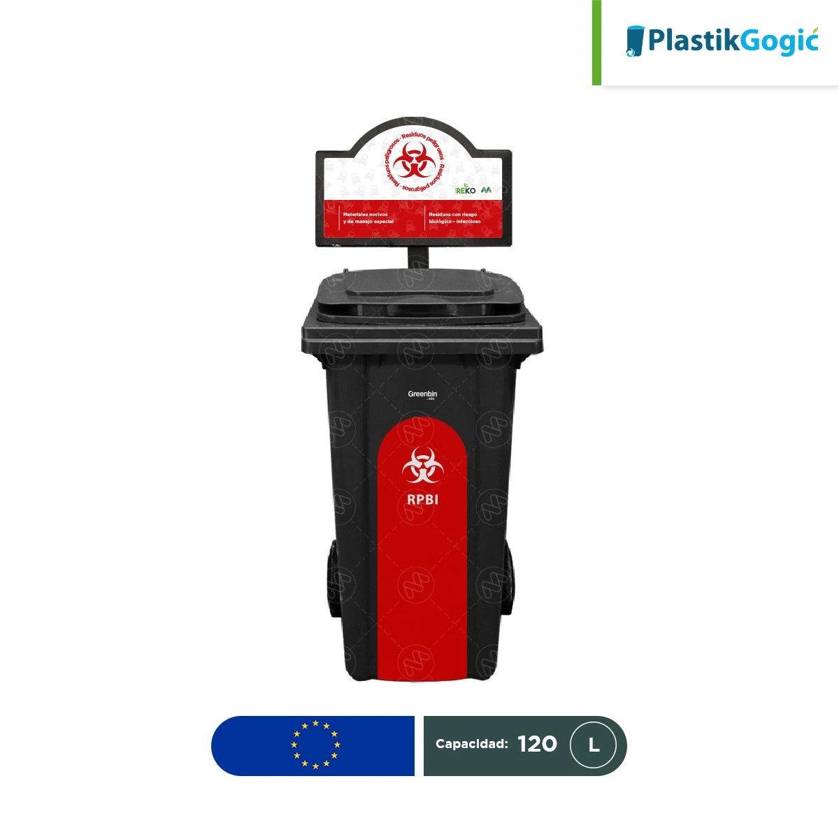 La estación ecológica individual con marquesina y base para asegurar los contenedores con 2 ruedas de 120 L de la marca Plastik Gogic, permite acomodar los contenedores en el orden que más le convenga y pueden asegurarse al piso (no incluye tornillos para su fijación).
