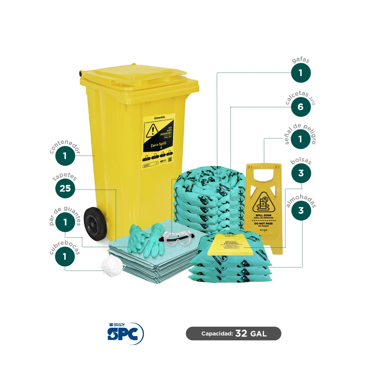 - (3) Almohadas absorbentes hazmat 18″x18″ SPC (SKU: HAZ1818).